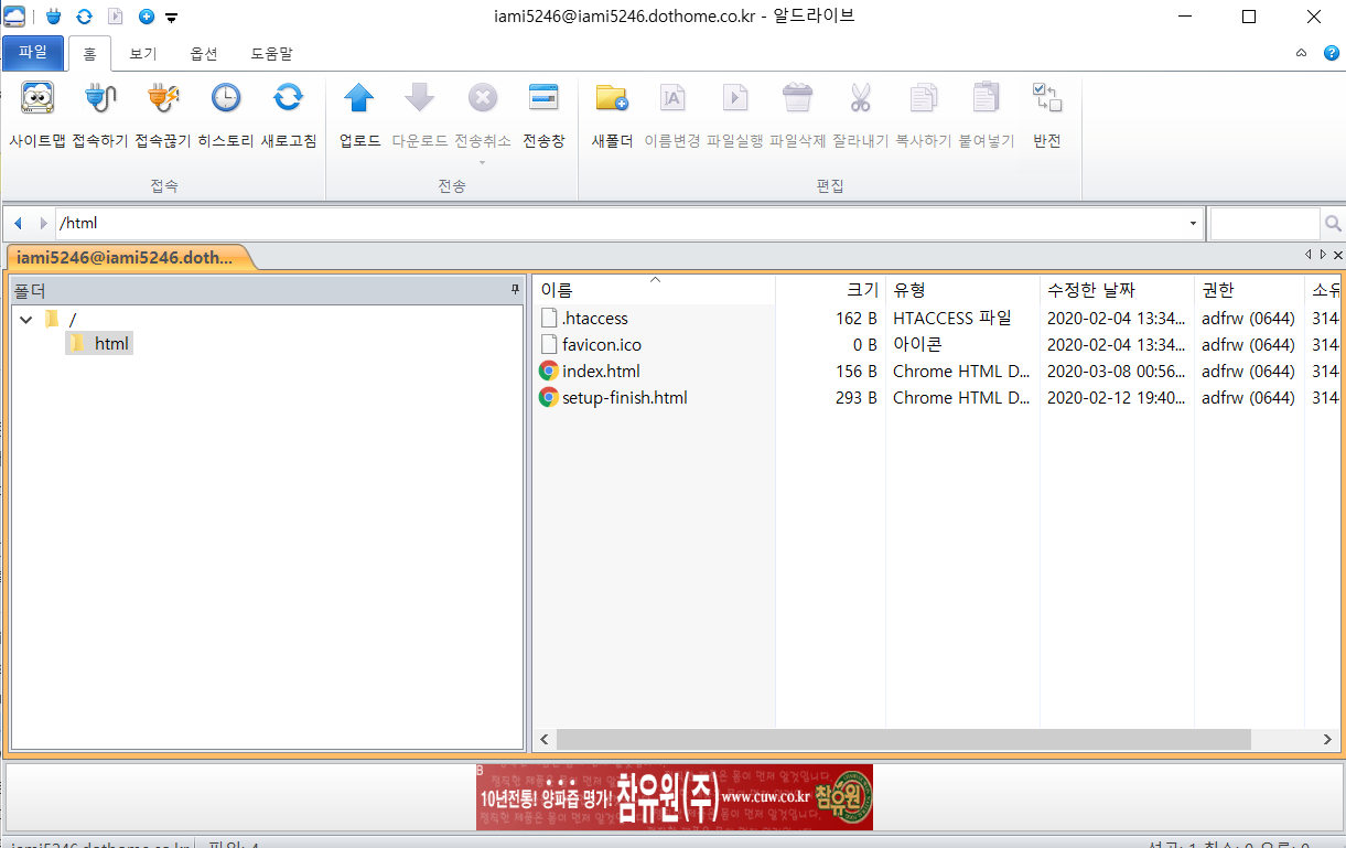 - 접속이 완료되면 알드라이브 내 html폴더를 클릭하고 해당 폴더로 들어간 후 여러분 컴퓨터의 탐색기에서 개발소스를 드래그앤 드롭으로 html폴더내에 샘플로 작성한 index.html 페이지를 복사해 넣습니다.