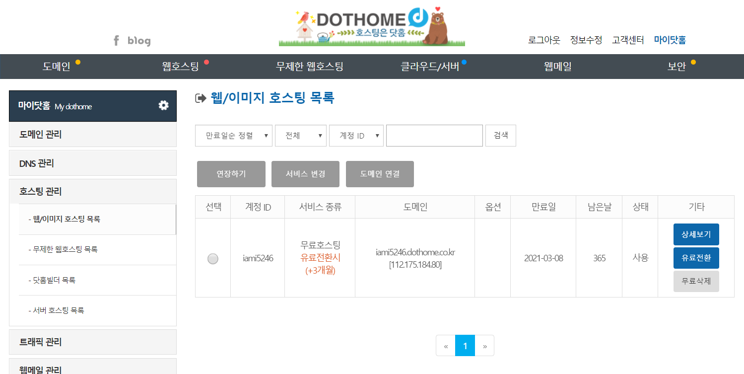 -신청 완료 후 상단 메뉴 오른쪽에 마이닷홈 메뉴를 클릭 후 좌측 메뉴> 호스팅관리>웹/이미지 호스팅 목록에서 무료 신청내역을 확인한다.